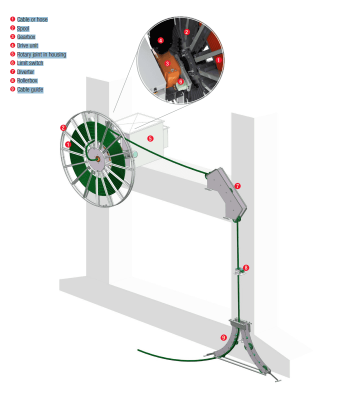 | Một hệ thống đáp ứng các yêu cầu này được gọi là tang quấn cáp (cuộn cáp điều khiển bằng động cơ). | ||||||||||||||
